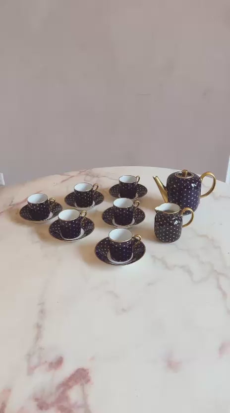 An exceptional coffee service designed and made by Richard Ginori in the 1930s in navy blue ceramic with gold stars. The set consists of 6 Espresso Cups & Saucers, A Coffee Pot and milk jug. All of the pieces have the original Richard Ginori Pittoria di Doccia on the base. These sets become more difficult to find each year and this one is as perfectly designed as it gets.