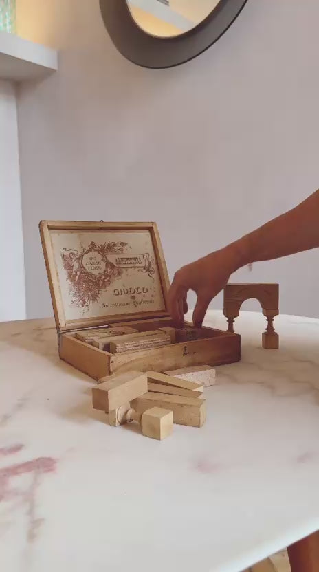 This 1930s game comes in a wooden box with a variety of building blocks inside. The top of the box says 'Architettura' (Architecture) and inside the lid it says, 'Arte Istruzione e Lavoro. Gioco Istruttivo e Dilettevole' (Art Education & Work. Instructive and Enjoyable Game). A wooden box full of wooden shaped building blocks, it is fun and frivolous, looks great on a desk or coffee table and appears to have no rules!