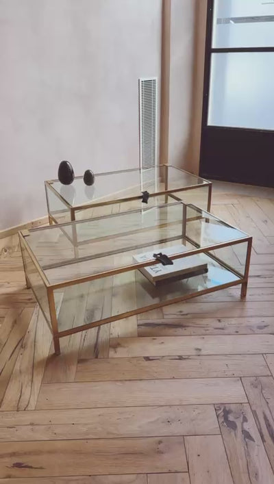 A heavy 1970s Brass and Glass Display Cabinet originally made for a jewellery shop in Rome. The lid / top of the display cabinet opens and pieces can be placed inside. Equally this can be used as a coffee table where books or ornaments can sit inside as well as on top. It is a very heavy piece with some minor scuffs on the brass as would be expected from a vintage piece. Please note, the handle to open the top is currently made of thick black cotton ribbon which functions well however we recommend that the piece would benefit from a piece of leather in its place. We have a total of three of these cabinets/coffee tables available.