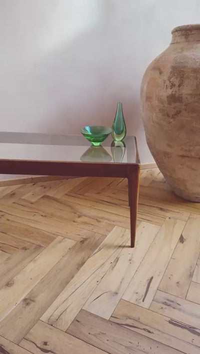 A perfectly designed piece of furniture. This walnut side table was designed by Gio Ponti in the 1950s. It still has its original issue number, 106, on a metal tag on the base. Perfectly proportioned, hand-carved walnut wood with a glass top. Currently on display at The Italian Collector Bottega, Firenze. Please enquire for details.
