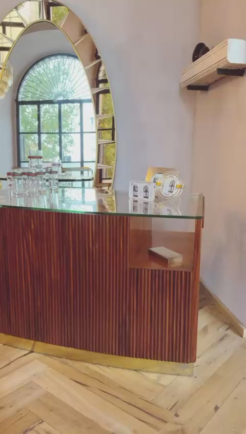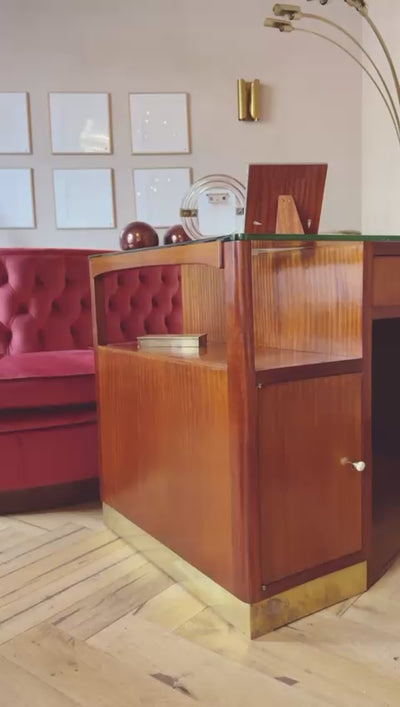 A superb Italian mid-century rosewood desk, attributed to Paolo Buffa (1903–1970), Milan. The piece is distinguished by its beautifully fluted Art Deco rosewood façade and thick raised glass top. The desk has three drawers, one large central desk drawer and a small cupboard. It also has open display niches and brass hardware on the cupboard and drawers. It was produced circa 1950, likely in collaboration with renowned Lombard ateliers noted for their high-quality finishes. The original rosewood features have been restored by Alessandro, our master restorer here in Florence. The original 1950s thick glass top has an extremely beautiful green hue in some lights.