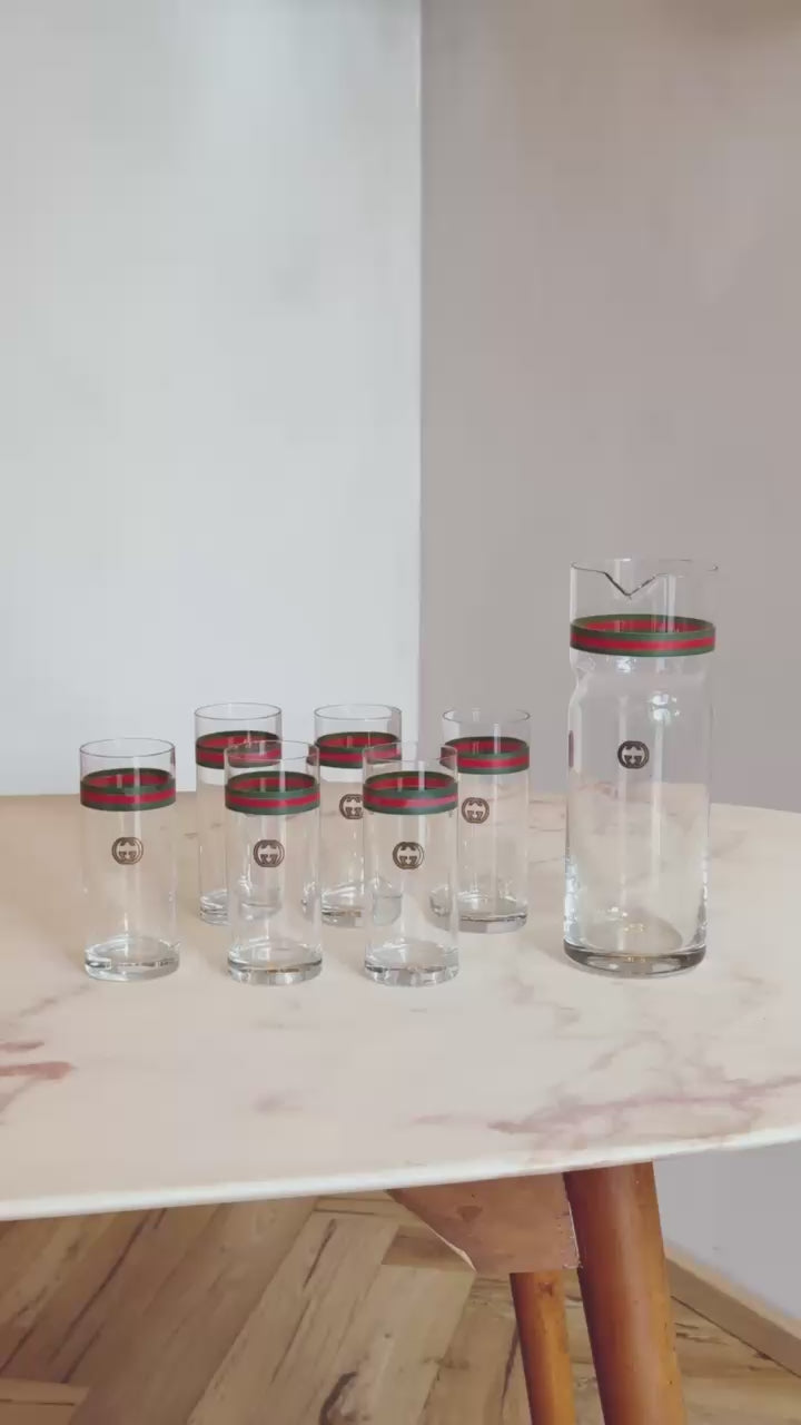 Found in a private home in Florence. A set of six iconic 1970s Gucci glasses and large decanter decorated with the Gucci Gs and the red and green Gucci stripes . These aperitivo icons are increasingly difficult to find year on year but I am always looking, as they are so sophisticated!