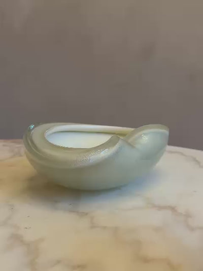 A large creamy white opaque Murano glass bowl with gold powdery flecks throughout submerged in a layer of transparent glass using the sommerso technique. This Murano glass bowl was made in Venice in the 1970s and was designed by Flavio Poli. It is a particularly beautiful piece which would look amazing on any desk or coffee table.