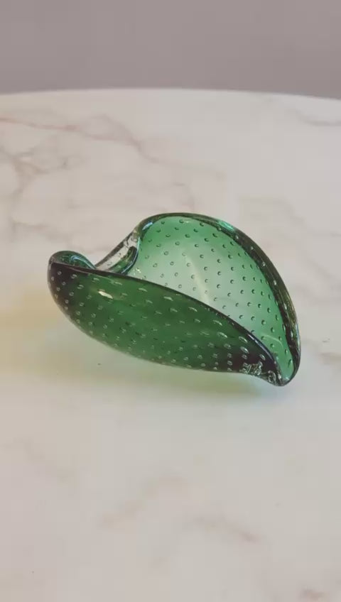 A very pretty 1970s small green hand-blown Murano glass 'Bolle' Bowl. This lovely pieces is leaf shaped, has bubbles throughout and is in good condition.