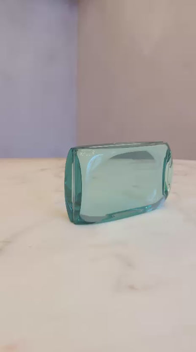 A wonderful find. This perfectly designed heavy glass picture frame in hand-blown turquoise glass was made by Fontana Arte in the 1960s and was found here in Italy. It is signed on the base as per the photograph. The design allows a photo or picture to slide between the two thick panes of glass. It can stand vertically, horizontally or be laid flat. An extraordinary design piece.