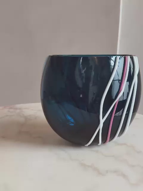 This inky midnight blue hand-blown Murano glass vase was designed by Versace for Venini, Venezia, and is dressed with playful opaque candy coloured canes. It is signed and dated on the base, and forms part of the sought-after Versace–Venini collaborations that unite high fashion with Venetian glassmaking. This is a limited edition piece in good condition.