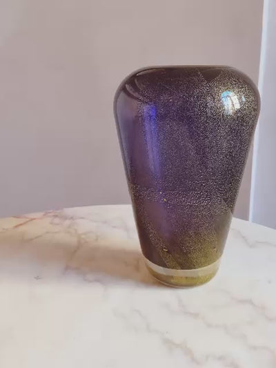 A wonderful deep purple and powdered gold hand-blown Murano glass vase designed in the1980s by Laura Diaz de Santillana and made for the renowned Venetian glass house, Venini. The colour and size of the vase are very impactful and the piece has an exceptionally beautiful neck and base. The vase is signed on the base.