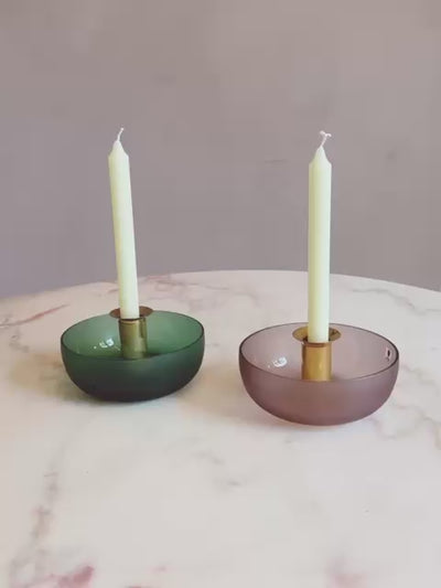 A pair of beautiful Venini Murano glass candlesticks in a soft rose and dark green vetro sabbiato (frosted glass). These pieces were made in the late 1970s and have an internal brass fitting to hold the candles. The glass is in excellent condition and the pieces still have their original Venini sticker. Exceptional coloured glass and collector's items.